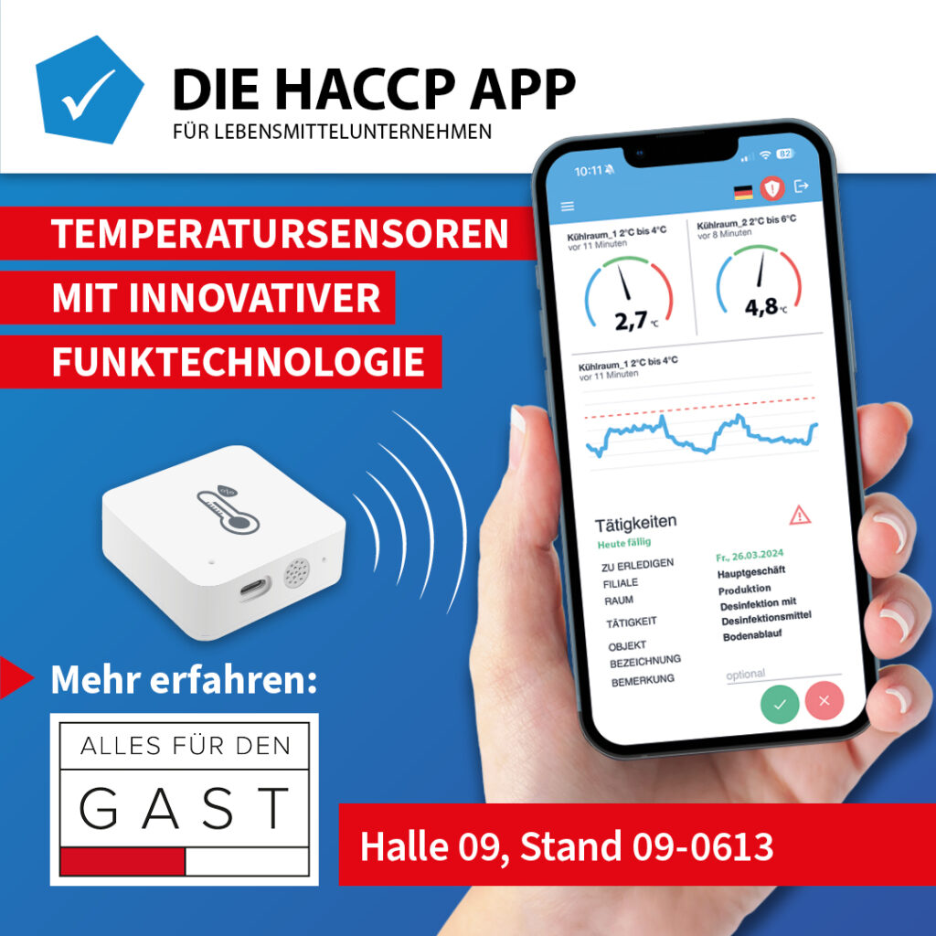 DIE HACCP APP bringt zur „Alles für den Gast“ in Salzburg die nächste Stufe der HACCP-Temperaturkontrolle in Küche, Lager und Service: kabellose Funk-Sensoren, die in Minuten einsatzbereit sind – ohne Bohren, ohne Stromanschluss, ohne IT-Hürde. Vom 08. bis 11. November finden Sie uns in Halle 09, Stand 09-0613.