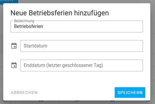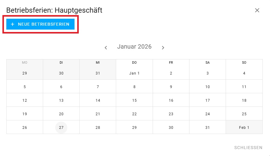 Wähle „Neue Betriebsferien hinzufügen“ aus.