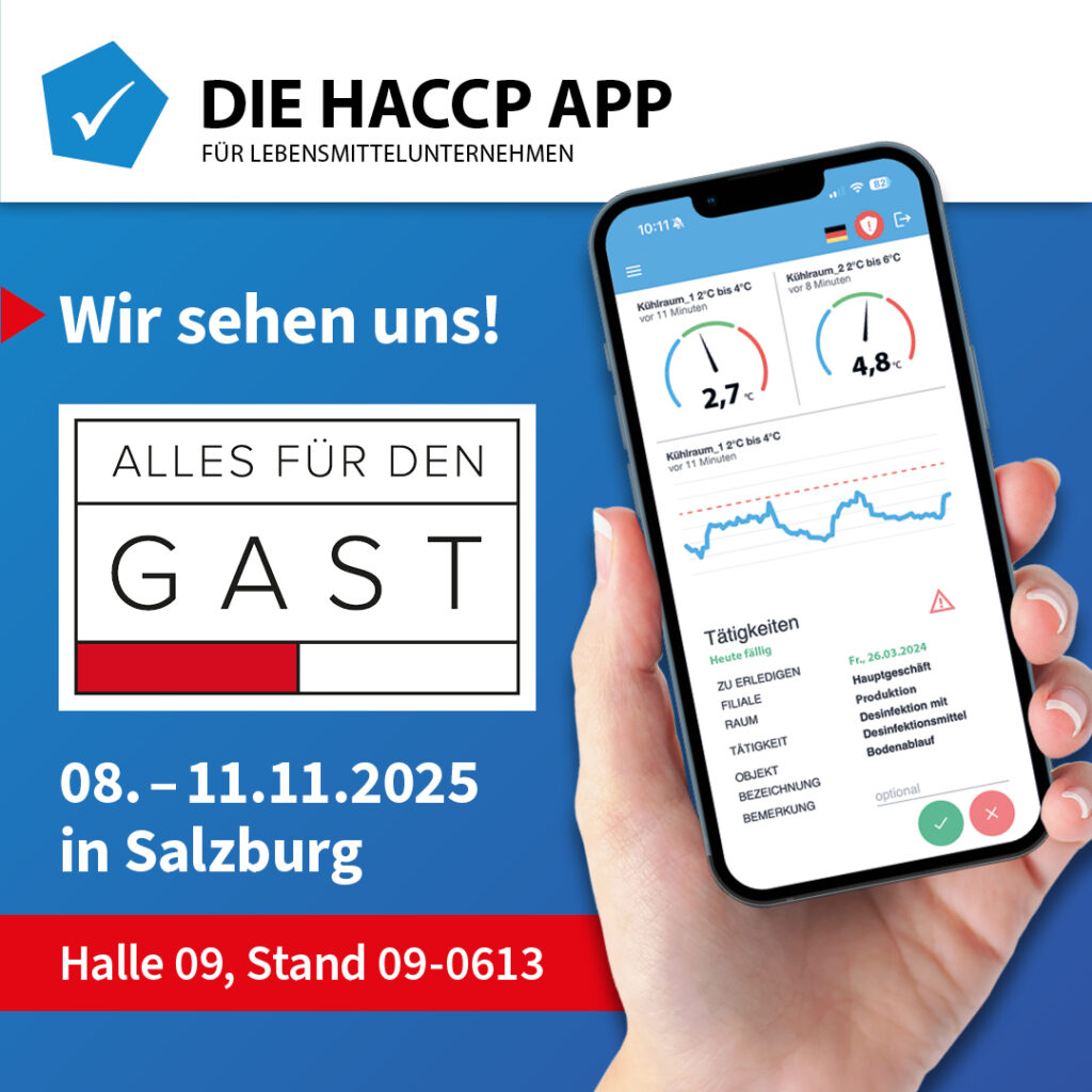 DIE HACCP APP ist 2025 auf der „Alles für den Gast“ in Salzburg vertreten – vom 08. bis 11. November in Halle 09, Stand 09-0613. Seit 55 Jahren ist diese Fachmesse der wichtigste Treffpunkt für Gastronomie, Hotellerie und Genusskultur im Donau-Alpen-Adria-Raum. Was 1970 klein begann, ist heute ein pulsierender Dreh- und Angelpunkt für Innovation, Netzwerk und Austausch. Genau in diesem Umfeld zeigt DIE HACCP APP, wie digitale Lebensmittelsicherheit im Alltag gelingt: effizient, papierlos und zuverlässig – von der Küche über das Lager bis zum Frühstücksbuffet, Bankett oder Room Service.